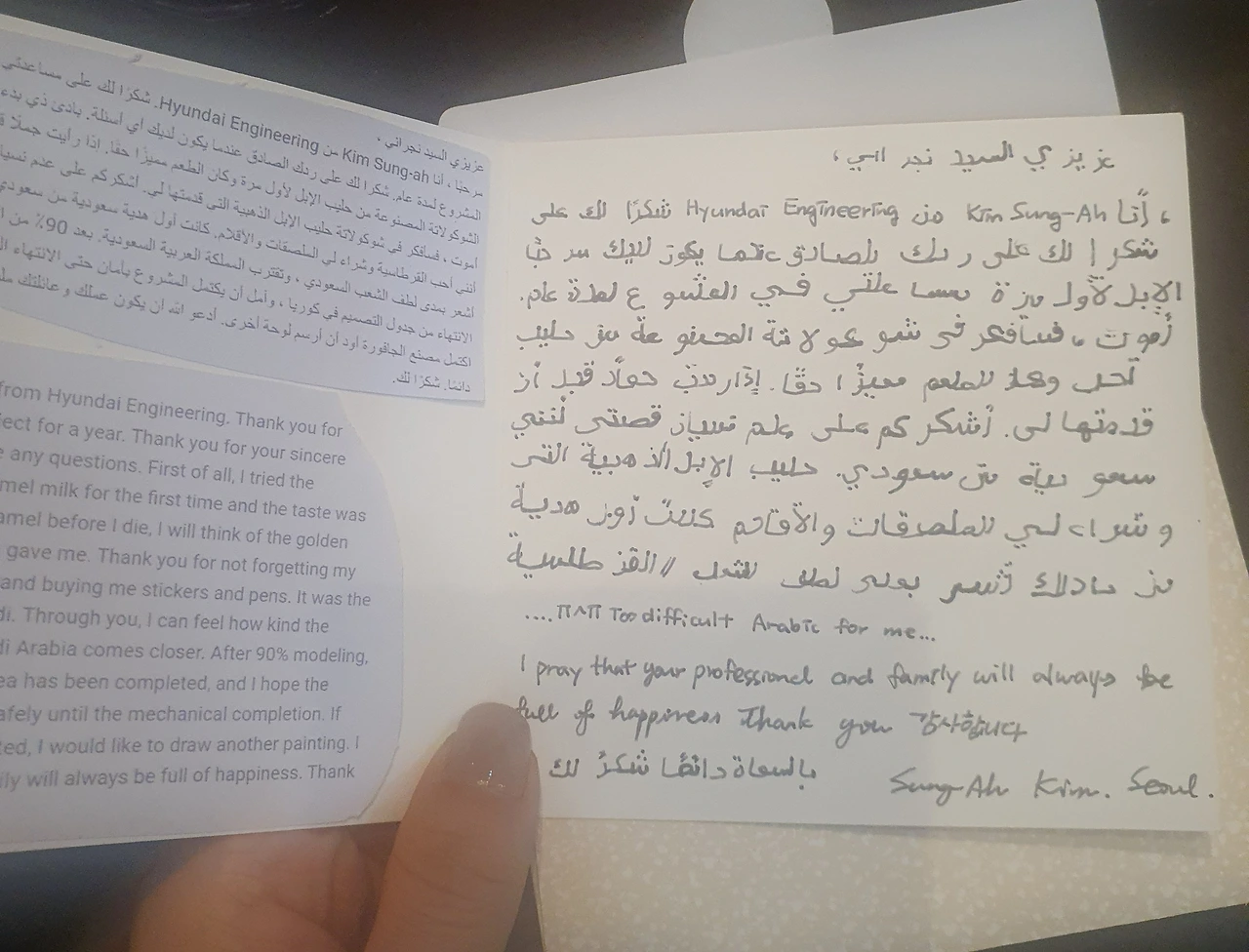 N씨가 미팅을 마치고 돌아가는 날에 그림을 전해 주면서 짧게 아랍어로 편지를 쓰기로 했다. 아랍어 감수는 내 옆자리에 있는 사우디 동료인 R이 맡아 주었다. 엽서를 쓰기 전에 먼저 하고 싶은 말을 생각한 다음 구글 번역기를 이용해 한국어를 아랍어로 번역했다. 그렇게 완성한 아랍어 초안 편지를 본 R은 피식 웃었다.