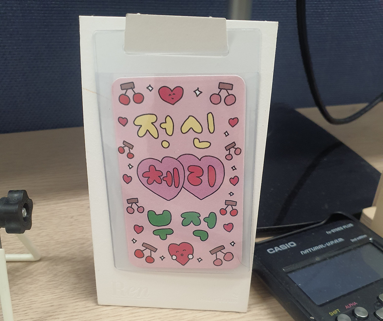 검정색과 하얀색으로 가득한 책상 위에 핑크색 부적을 올려두었다. 물론 종교 상 부적을 좋아하진 않지만 '최고심' 작가의 굿즈인 '정신체리 부적'에는 '정신 차려라'라는 야무진 의미가 담겨 있어 아주 좋아한다. 부적을 보노라면 흑백톤이었던 머릿속에 핑크색 물감 한 방울을 콕 찍어주는 것 처럼 작은 활력을 준다.