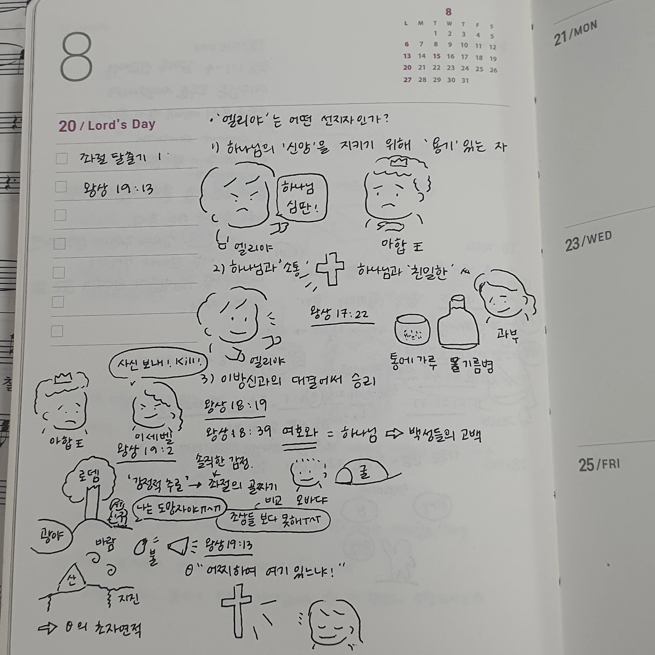 설교시간에는 교회 주보나 작은 교회 수첩에 설교 내용을 적는 우리 엄마, 전 권사님. 그 DNA를 고스란히 물려받아 나도 성경공부를 하며 혼자 쓰는 노트를 따로 마련했고 교회에서 설교말씀을 들을 때 그 노트에 끄적이곤 한다. 예배가 끝나면 사진을 찍어서 성가대 사람들 단톡방에 공유해 주곤 하는데, 권사님들, 집사님들이 정리를 잘했다고 종종 칭찬해주시기도 했다.