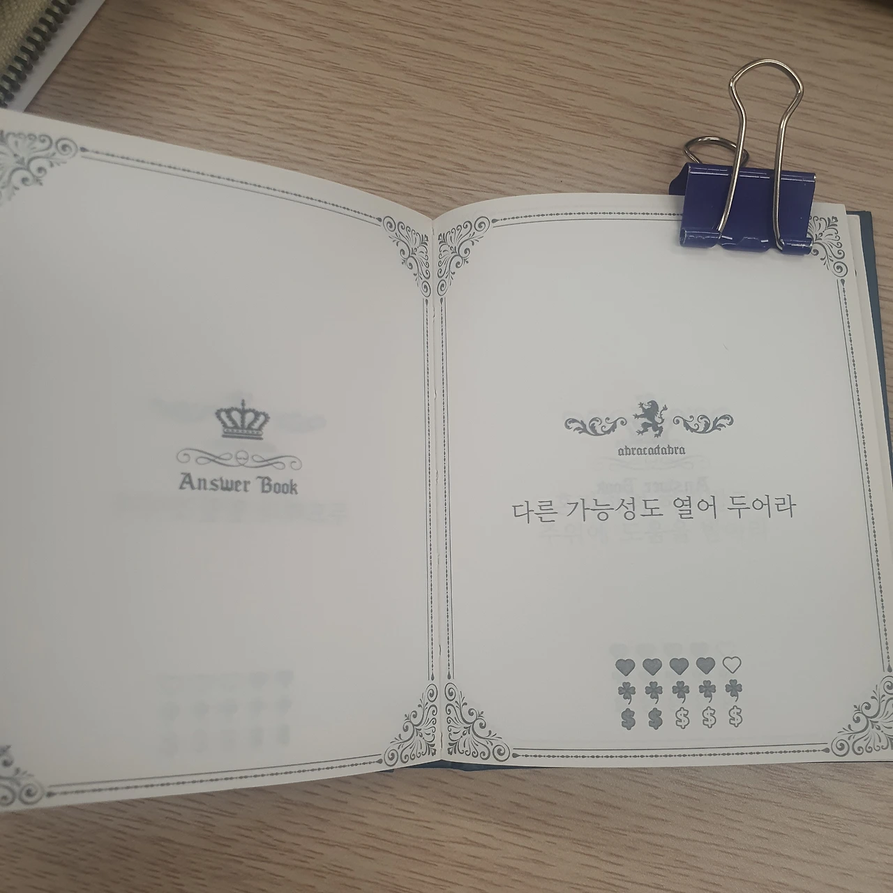 종교적인 이유로 어떤 미신도, 타로점도 믿지 않지만, 재미 삼아 보는 책은 딱 하나 있다. 바로 '마법의 고민 해결책'이다. 몇 년 전 독서모임을 할 때 글벗으로부터 받은 선물이었는데 책상 위에 두고 가끔씩 펼쳐본다.