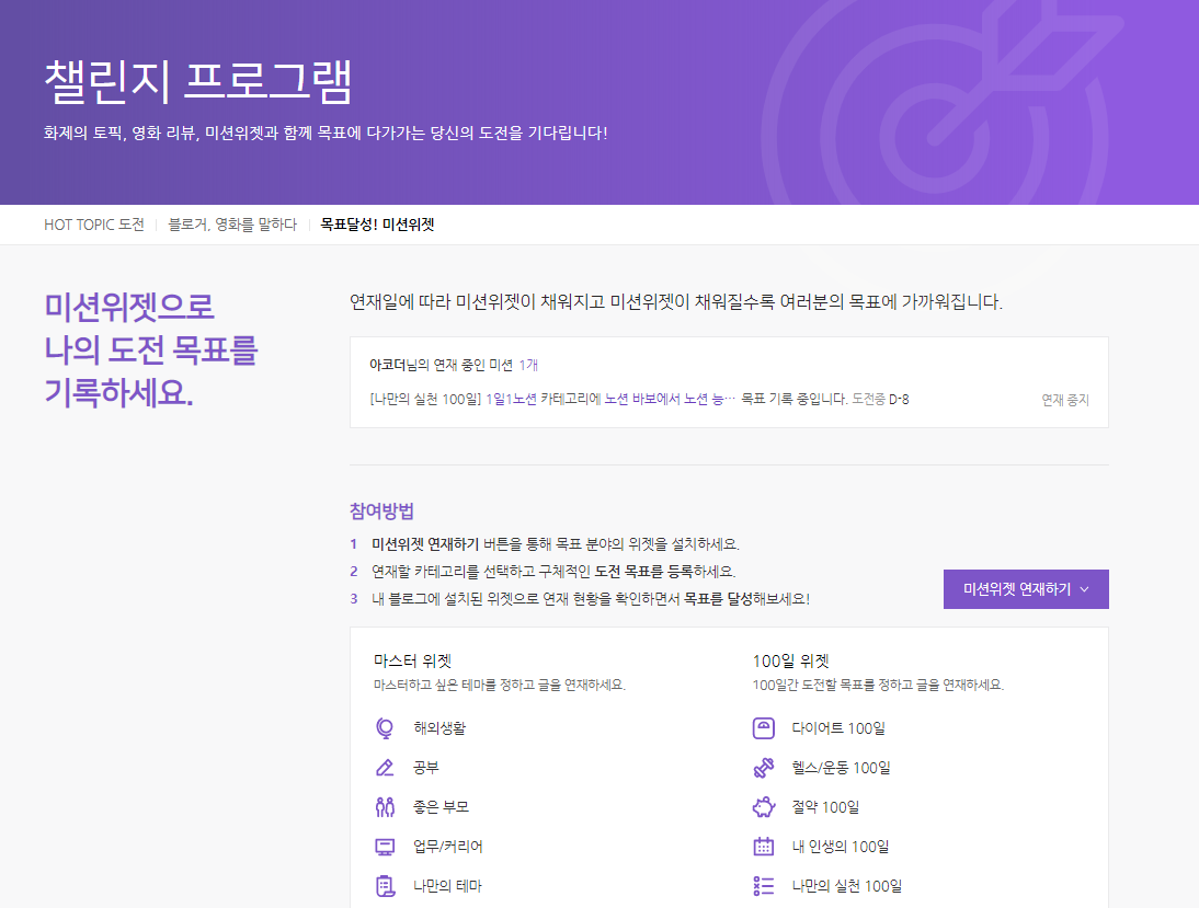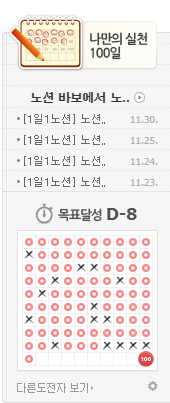 아날로그 기록을 어려워하는 사람들을 위한 팁이다. 네이버 블로그에서 제공하는 챌린지 프로그램에서 목표달성! 미션위젯’ 을 추천한다. 단, 전체 공개와 검색허용이 설정된 글에만 적용되어 남에게 보여주는 기록이 된다.