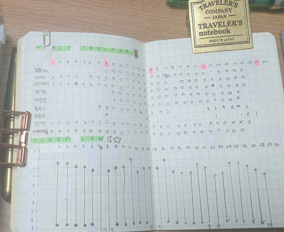 마지막으로 고안한 것이 바로 방안노트에 불렛저널 형태로 같이 해빗트래커를 기록하는 방법이었다. 가로형태로 날짜를 길게 쓰고 만들고 싶은 습관의 내용을 간략히 세로줄에 써서 O,X 로 기록했다.