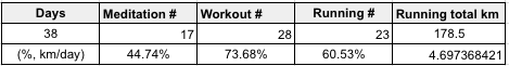 대회 나가기 전에 준섭 님, 관웅형과 대모산을 뛰었던 것 말고는 특별한 훈련을 하진 않았다. 평소에 마음 내키는 대로 근력 운동을 하고, 달리기를 했다. 그러고 보니, 점심시간에 운동할 때 트레드밀에서 경사를 좀 더 높여서 뛰는 연습을 추가 하긴 했다. 이게 그래도 도움이 된 것 같은 게, 대회에서 오르막 올라갈 때 트레드밀 위에서 연습했던 움직임이었기에 몸이 생각보다 더 힘들어하지 않았다. 아래는 10월 4일부터 11월 10일까지의 명상, 근력운동, 달리기 기록을 요약한 것 (전체 일지는 https://goo.gl/xBCHK7에서 볼 수 있다).