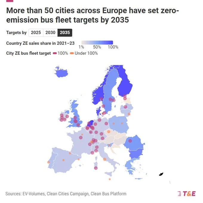 주요 도시: 2035년까지 54개 도시가 제로 배출 버스 목표.