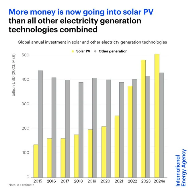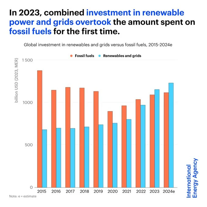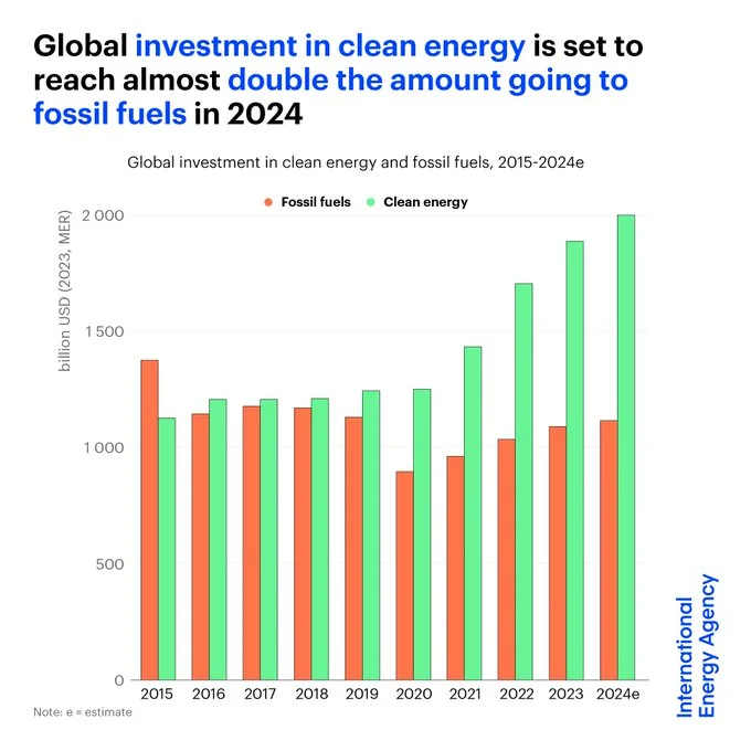 IEA의 연례 세계 에너지 투자 보고서에 따르면, 2024년 전 세계 에너지 투자 총액은 3조 달러를 초과할 것으로 예상되며, 이 중 약 2조 달러는 재생에너지, 전기차, 원자력, 그리드, 저장 장치, 저배출 연료, 효율성 개선 및 히트 펌프 등 청정 기술에 투입될 예정이다. 나머지 약 1조 달러는 석탄, 가스 및 석유에 투자된다. 2023년에는 재생에너지와 그리드에 대한 투자가 처음으로 화석 연료에 대한 지출을 초과했으며, 이번에는 그 비중이 2:1로 완전히 역전된 상황을 보여준다.