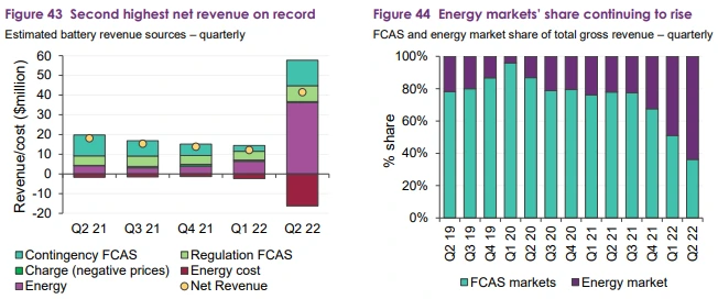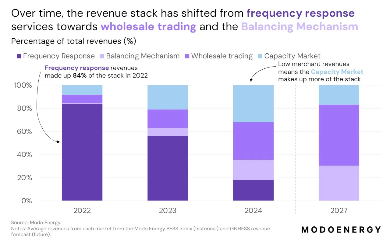 영국의 그리드 배터리는 이미 "주파수 응답" 시장을 포화시켰으며(그리드에 필요한 모든 FR을 제공하기 위해 실제로 많은 배터리가 필요하지 않기 때문에) 대신 이제 수익은 균형 조정 및 거래에서 발생하고 있다.
