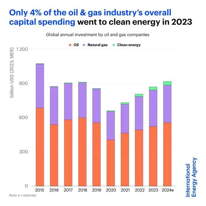 그리고 석유 및 가스 회사의 청정 에너지 투자는 2023년에 300억 달러에 이르렀으며 이는 업계 전체 자본 지출의 4%에 불과하다. 최근 석유·가스 투자 반등은 중동과 아시아 국영석유회사들이 주도하고 있다.