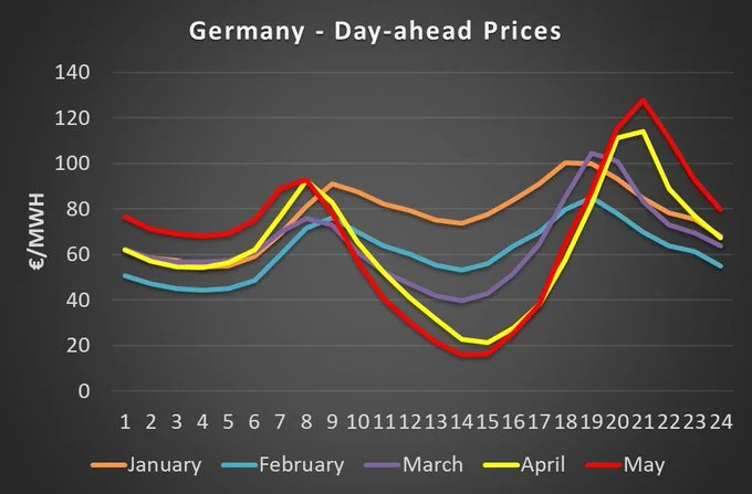 1) 재생 가능 에너지의 간헐적 공급: 독일은 태양광과 풍력 발전이 주요 재생 가능 에너지 원천이다. 태양광 발전은 낮 동안 집중적으로 전력을 생산하며, 풍력 발전은 날씨 조건에 따라 크게 변동한다. 이러한 간헐적 특성은 전력 공급의 일관성을 떨어뜨리고, 이에 따라 전력 가격의 급격한 변동을 초래한다 (Bundesnetzagentur) (FfE).
