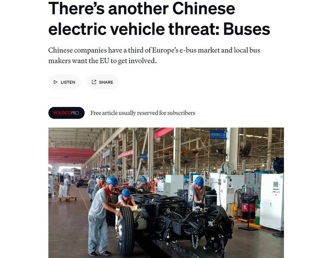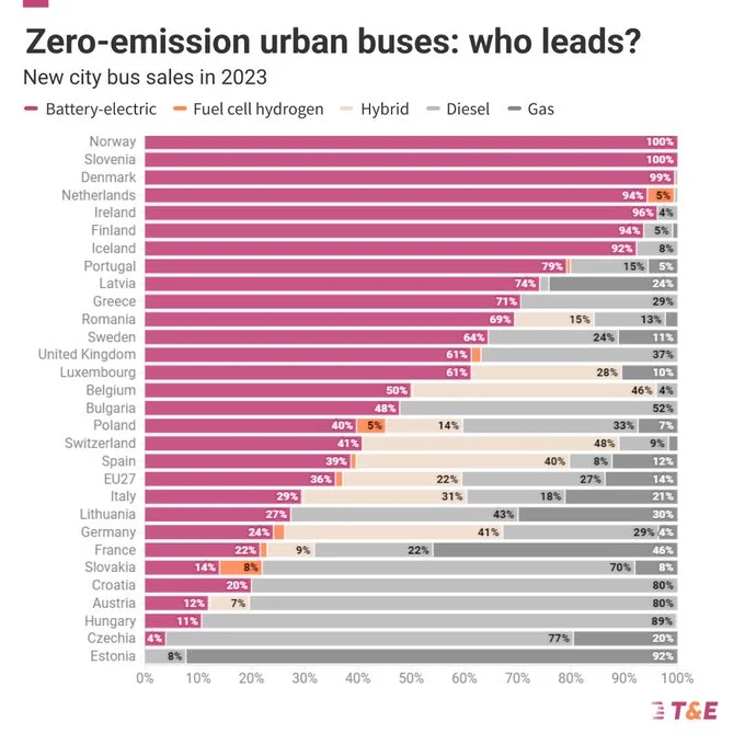 2023년 EU 신규 시내 버스의 36%가 배터리 전기 버스로, 처음으로 디젤을 앞질렀다. 2027년까지 모든 신규 EU 시내 버스가 제로 배출(ZE) 버스가 될 수 있다. 주요 시장에서는 영국이 2023년 신규 판매의 63%가 ZE 버스로 가장 높다. 다임러 버스는 2030년까지 100% ZE 시내 버스를 판매할 목표를 가지고 있다. 2017년 이후 유럽에서 판매된 신규 배터리 전기 버스의 20%가 중국산이다. 유럽산 전기차의 보급을 촉진하는 새로운 보완적 규제가 필요하다는 지적이다.