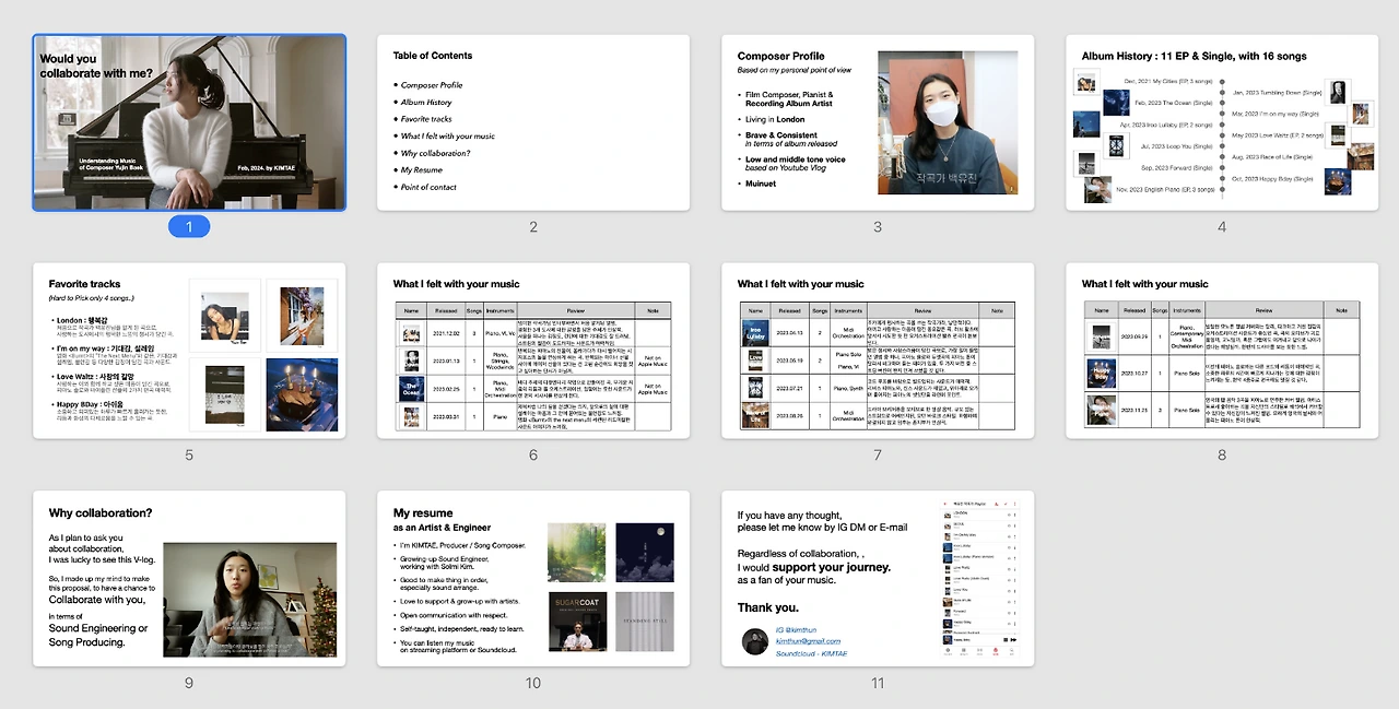 곡들을 깊이 반복해서 듣다 보니, 정서와 특성이 보이기 시작했습니다. 이 곡은 이렇게 편곡해도 재밌겠다 싶기도, 이 곡은 다시 믹스한다면 이런 사운드로 만들어보고 싶다는 생각도 들고요. 작품을 통해 느끼는 생각과 아이디어들을 정리하고, 저에 대한 간단한 소개와 함께 콜라보레이션 제안서를 꼬박 3주간 만들어서 메일로 보냈습니다.