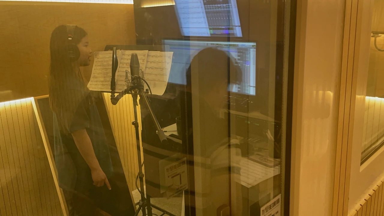 레코딩하는 예나와 유리에 비치는 프로듀서