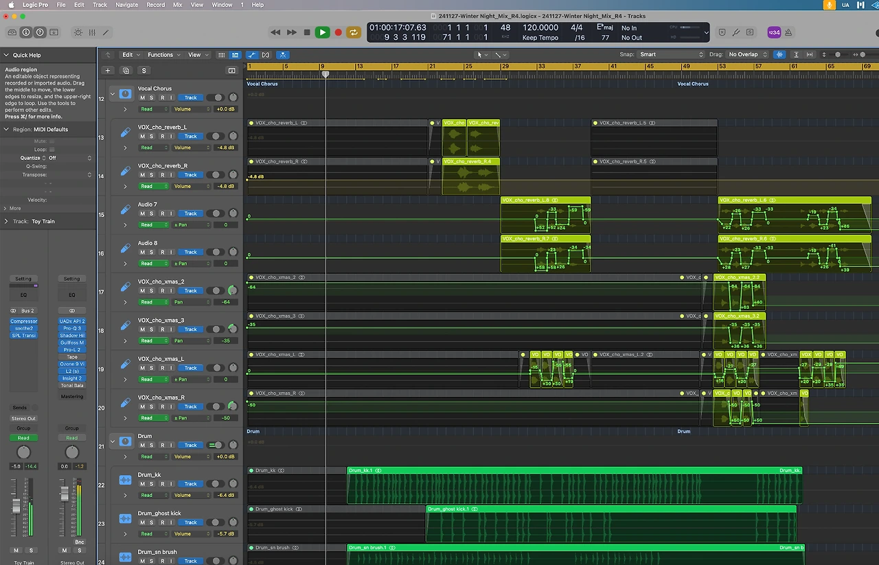 작업을 진행하면서 재미난 여러 가지를 시도해 봤습니다. 리듬의 한 축인 클랩 사운드의 찰진 매력이 드러나도록 딜레이와 리버브, 패닝 등 여러 방법을 사용해 보았습니다. 후반부의 크리스마스 코러스는 눈이 흩날리는 이미지를 상상하며 작업했습니다. 베이스의 저음이 너무 부하지 않게 여러 차례 사운드를 잡았고, 다양한 트랙이 전체적으로 질서 있게 들리도록 레벨과 위치를 다듬었습니다.