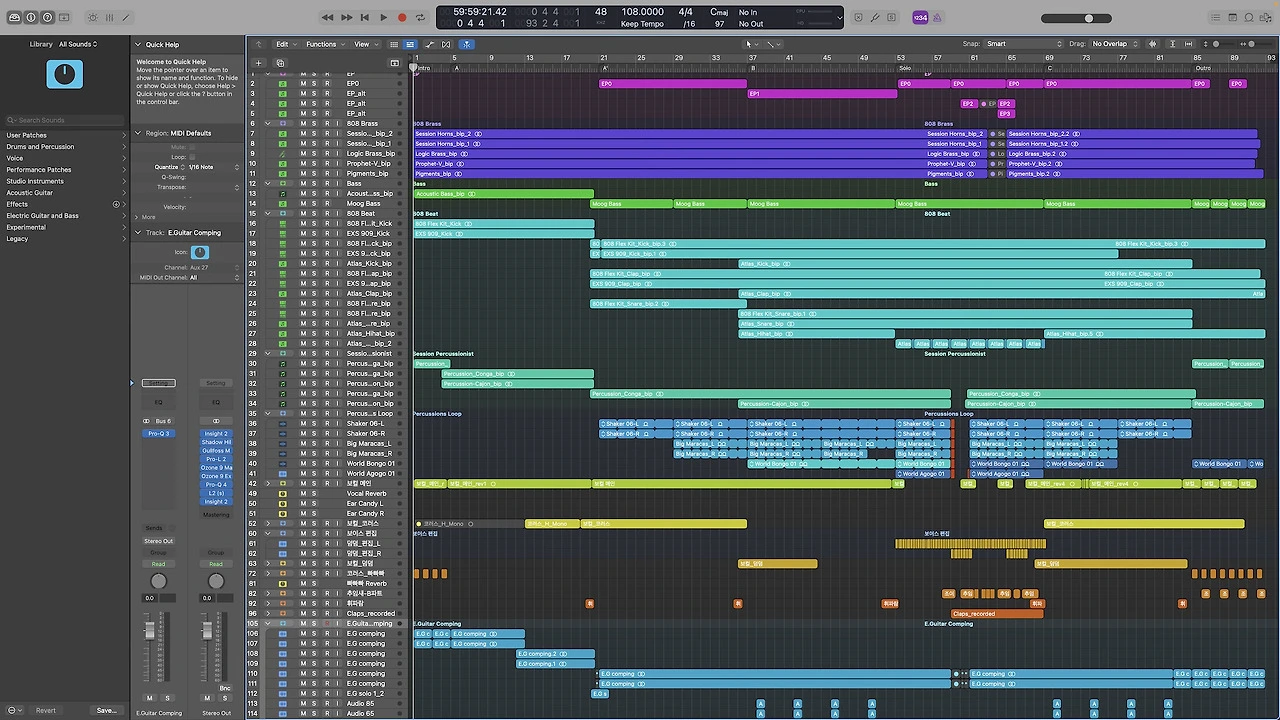 이번 편곡에서 EP(Elec. Piano)는 빠질 수 없는 요소에요. EP의 따뜻하면서도 그리움이 느껴지는 톤이 참 좋습니다. 올해 배우고 있는 재즈피아노의 감각도 넣고 싶어서 처음엔 화려한 솔로를 써봤는데, 몸에 안 맞는 옷 같이 들리더군요. 연습이 부족하다는 것을 깨달으며 미련없이 걷어냈습니다. EP에 모드 스케일을 적용해 보기도 했습니다. 리디안 모드 (스케일에서 4도를 반음 올리는 것)를 중간중간 넣었는데, 나름 매력적인 느낌이 들어요. 쓰기에 적절한 포인트도 알고 있어서, 나름 그동안 배운 것을 잘 활용한 것 같습니다.
