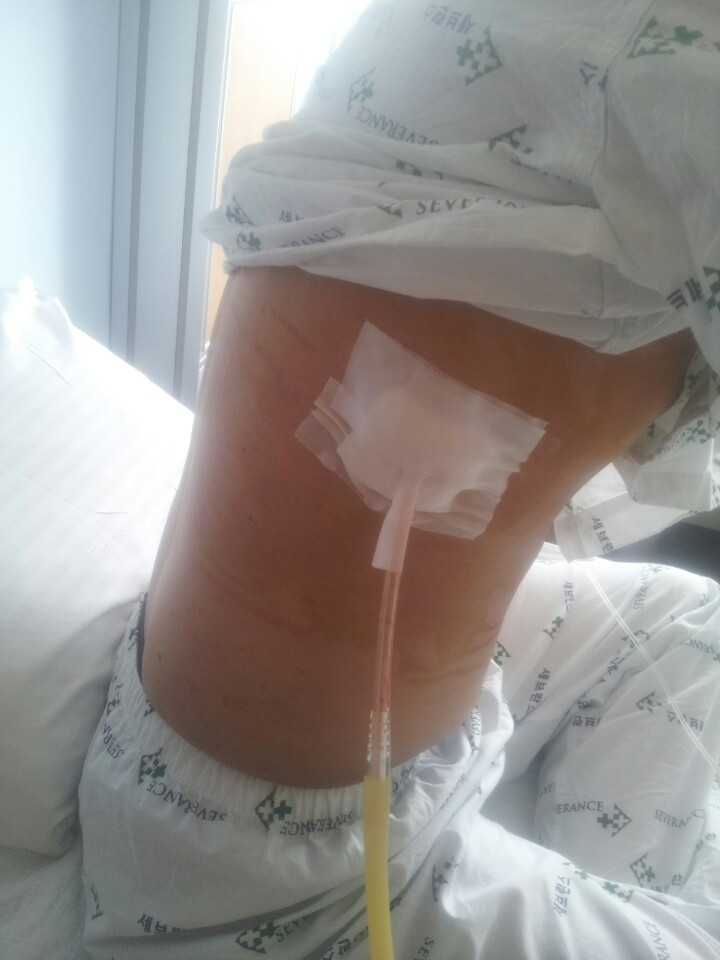 결국 옆구리 갈비뼈 사이에 사람 중지 손가락 굵기의 호스를 삽입했다. 뼈 사이로 튜브가 들어가니까 “아...아읏.. 거.. 거기는 안됬..!”같은 망가 속 여주인공이나 말할 듯한 대사가 저절로 나왔다.