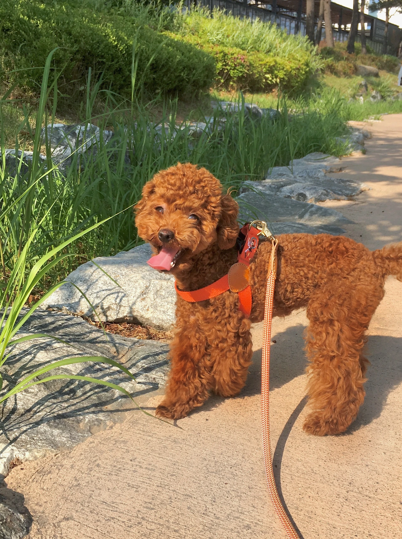 앉아만 있고 보라가 계속 조물조물거리니 돌프도 좀이 쑤신가 보다. 자꾸 벤치 아래로 뛰어 내려가려 한다. 나는 보라에게 돌프와 산책하는 것을 제안하고는 셋이 같이 공원을 걸었다. 그리고 보라에게도 돌프 산책의 주체적인 참여자라는 느낌을 받게 해주고 싶었다. 돌프의 산책 줄을 보라에게 잠시 넘겨줘 보고 싶었다. 돌프 일에 있어서는 안전 제일주의인 돌프 엄마지만, 야무진 보라를 보아하니 괜찮을 것 같아 보라에게 의사를 물었다. 내 말에 화색을 하며 반기는 보라. 나는 허리를 숙이고 보라에게 천천히 설명했다.