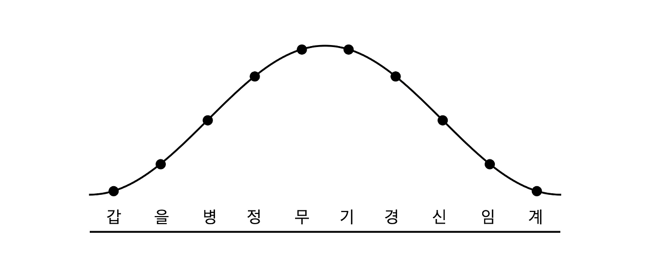 "이건 10 천간(甲, 乙, 丙, 丁, 戊, 己, 庚, 辛, 壬, 癸)을 표시한 것이다. 12 지지(子, 丑, 寅, 卯, 辰, 巳, 午, 未, 申, 酉, 戌, 亥)도 어차피 마찬가지지. 아까 기온이 오르고 내리는 것을 보면서 이런 모양의 그래프를 분명 보았을 것이야. 그런데 옛사람들은 이걸 구분해서 천간과 지지로 나눠놨거든. 자, 우리 써리에게 승진 기회를 주겠다. 옛사람들이 이렇게 10 천간 12 지지로 구분한 이유는 무엇이라고 보느냐?"