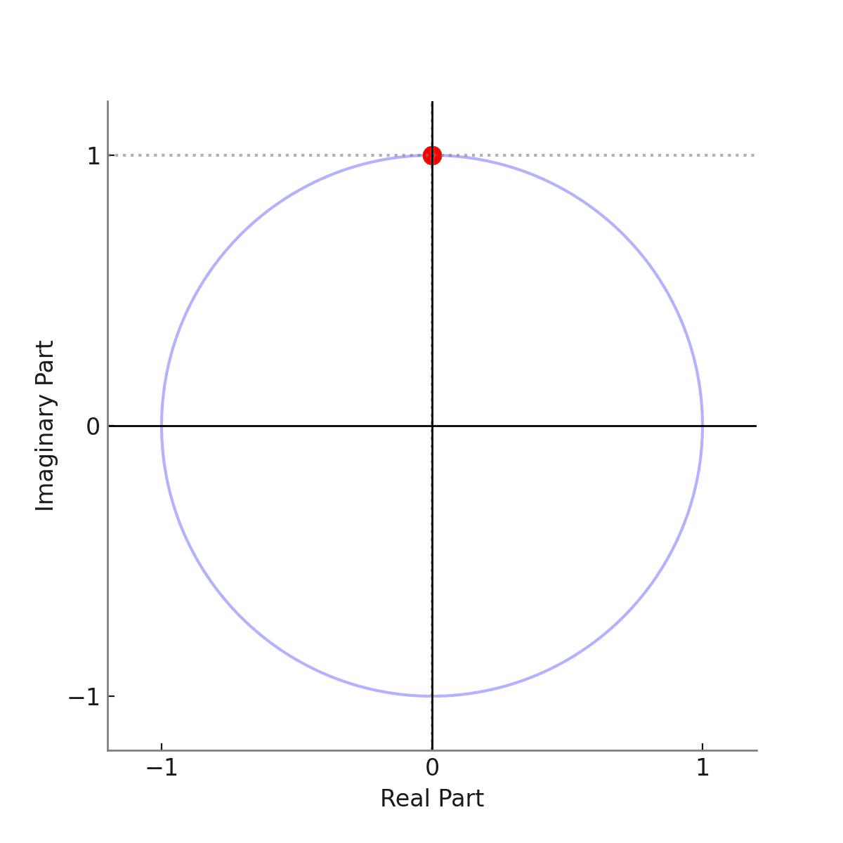위의 (1)식을 이용하면 아래의 그래프를 그릴 수 있다. 앞서 살펴보았던 반반치킨이 아니라 온전한 하나의 단일식이다. 다만 좌표평면에 허수를 표시해야 되므로 가로축은 실수부 Real Part, 세로축은 허수부 Imaginary Part로 구성되는 복소평면으로 바뀐다.