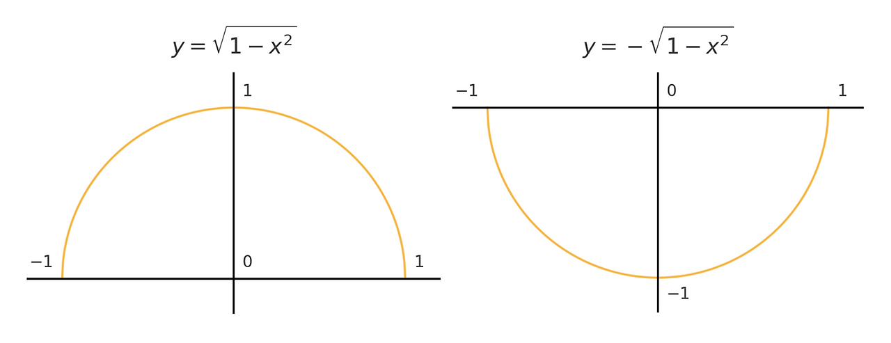 결국 이 식은 단일한 한 개의 식이 아니라 조건부 수식 두 개를 붙여 놓은 것이다. 그 두 개의 수식을 따로따로 표현하면 아래와 같다. y>0 인 경우에는 왼쪽 식과 그래프, y<0 인 경우에는 오른쪽 식과 그래프가 된다. 똑같이 생겼으나 앞에 부호만 (+)냐 (-)냐의 차이다.