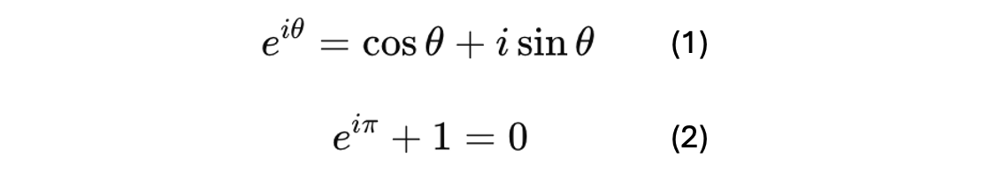 그러나 제곱근을 씌워서 음수가 되는 바로 저 허수를 동원한다면 원은 한 개의 단일한 식으로 그려진다. 이제 드디어 오늘의 주인공 레온하르트 오일러 Leonhard Euler (스위스의 수학자, 물리학자 / 1707~1783)가 등판할 차례다. 아래의 식이 바로 오일러의 공식이다. (1)은 좀 복잡하지만 일반모형이고 (2)는 반지름이 1인 단위원을 가리키는 특수형이다. 같은 뜻이다.