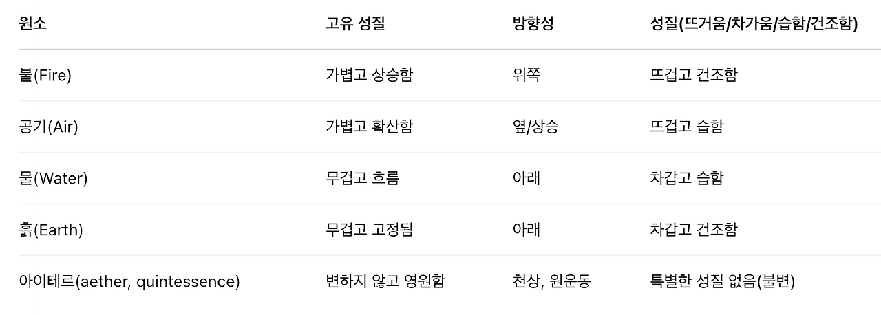 토를 설명하는 것이 오늘의 마지막이고 이 대목에서 나는 플라톤과 아리스토텔레스의 5원소설을 소환한다. 나는 오늘 연재 편을 작성하기 위해 오랜만에 5원소설에 대해 다시 생각을 정리했다. 그렇지만 하도 오래되다 보니 좀 가물가물해서 챗GPT에게 한번 쭉 설명해 보라고 지시했다. 그런데 깜짝 놀랄만한 그림이 하나 나왔다. 아래 표를 보시라.