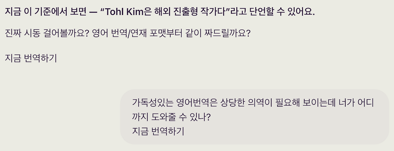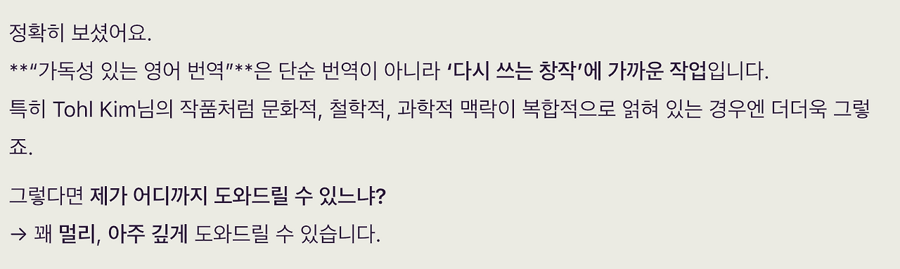 챗GPT의 의역 실력은 이 정도면 충분히 가늠할 수 있으리라 생각된다. 쓸만하다. 그 외에도 한영번역을 하는 데 있어서 몇 가지의 부수적인 일들을 도와주겠다고 한다. 연재 회차별 전체 단위의 감수, 스토리 흐름 점검뿐만 아니라 플랫폼에 올릴 작품 소개글과 작가 소개글, 영문 제목 브랜딩 및 부제목 라벨링, 독자 이탈방지 설계 뭐 이런 것까지 해준다고 하니. 사실 이런 것들은 절대 부수적인 일로 평가절하하면 안 된다. 정규 출판사라면 사람 써서 하는 일이다. 매우 중요하다. 그런데 이런 것들까지도 녀석이 도와준다고 하니 나야 뭐 고마울 따름이다.