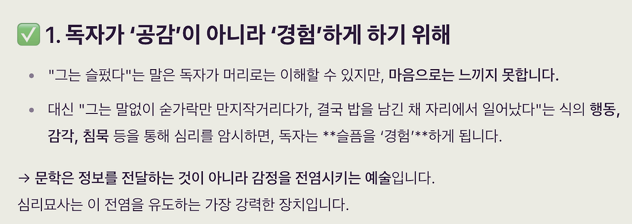 소설이 '독자경험'이라면 설명보다는 '묘사'를 통한 방법이 훨씬 쉽게 목적을 달성할 수 있다고 본다. 또한 위에서 AI가 얘기했다시피 문학은 정보전달이 아니라 감정을 전염시키는 예술이라는 것도 대단히 고차원적인 통찰이라고 본다.