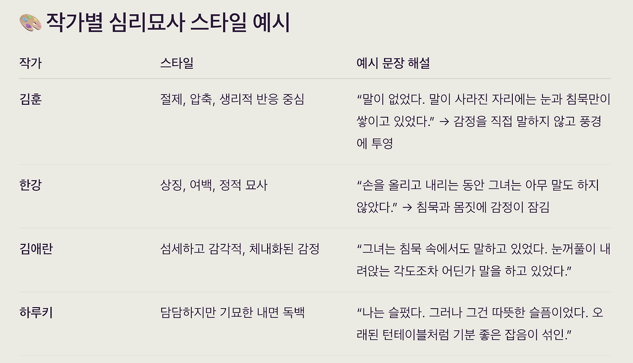 작가마다 스타일에 차이가 있다는 것이 눈에 보인다. 각자의 개성이 다르니 그럴 수밖에. 또 이런 심리묘사는 대개 시적인 아포리즘으로 흘러갈 수도 있고, 직유나 은유를 동원한 비유법으로 처리하는 경우도 많은 것 같다. 작가의 역량이란 것은 소설작화에 있어서 다양한 형태로 드러날 테지만 이런 심리묘사를 처리하는 방법이야말로 분명 그 작가의 힘 그리고 수준이 아닐까 싶다. 어쨌건 AI는 나에게 이런 면이 부족하다고 한다. ㅜㅜ
