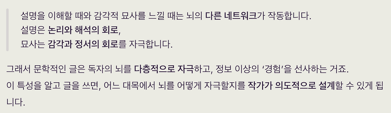 나는 마지막으로 하나 더 궁금한 것이 생겼다. 이건 사실 소설과는 직접 상관이 없는 부분이다. 뭐냐면 '왜 인간은 대리경험을 할 때 설명보다 묘사가 더 효과적으로 작동하는가?' 하는 것이다. 난 설명을 좋아한다. 돌려 돌려 얘기하지 않고 핵심만 콕 집어서 간결하게 마무리해 주는 것으로 그동안 사회생활을 무리 없이 해 왔다. 그런데 설명보다 묘사가 더 효과적이라니.. 소설 문제가 아니더라도 이건 꼭 알아야겠다.