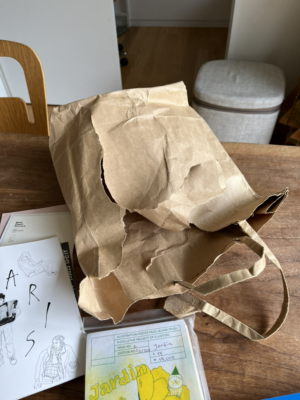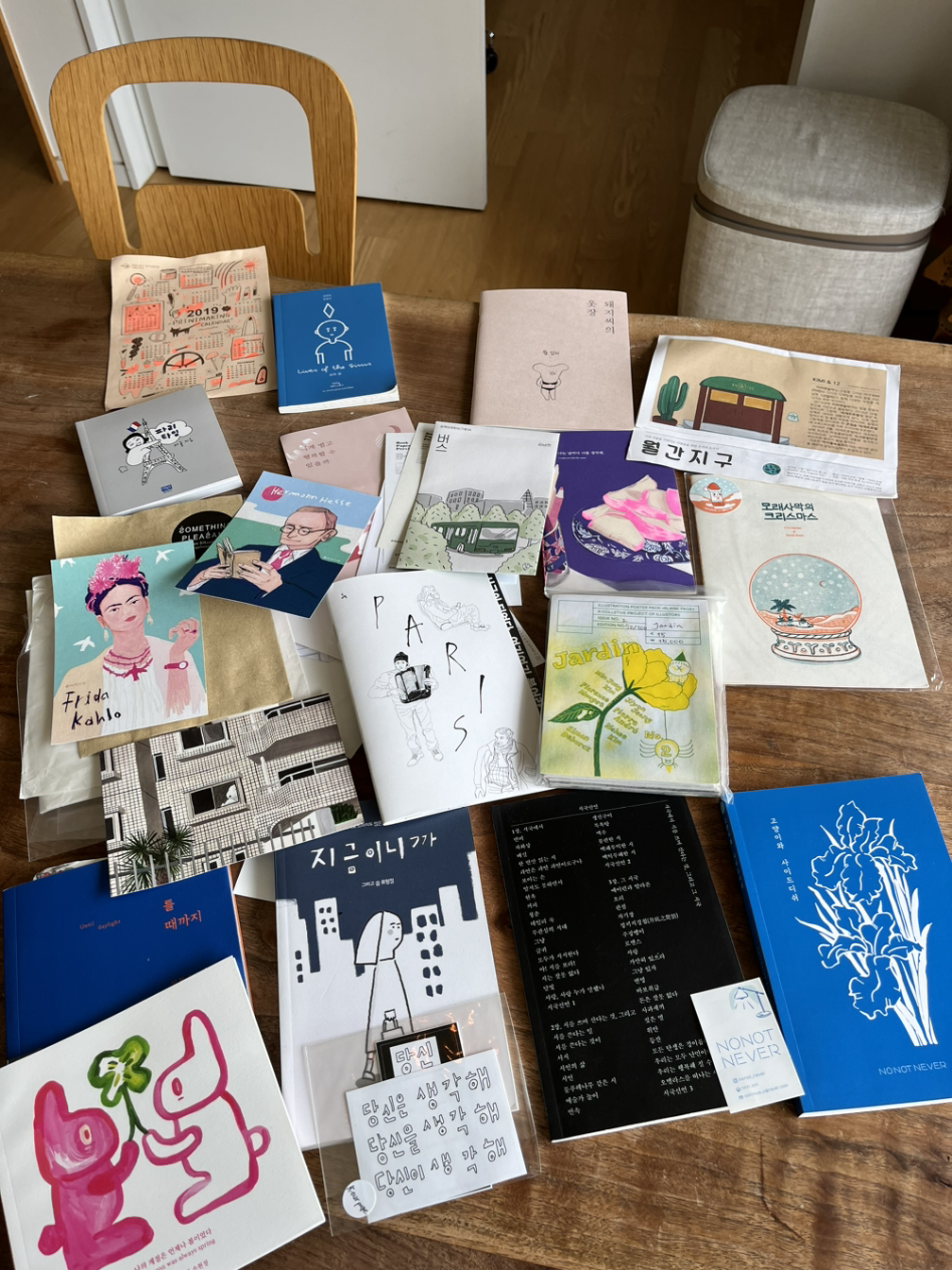 전에 남편과 퍼블리셔스 테이블과 독립서점 투어를 하며 ‘나도 이런 거 만들어 보고 싶다’며 이것저것 사 모은 책들이 생각났다. 서랍 깊은 곳에서 다 찢어진 종이봉투를 찾았다. 식탁 위에 꺼내어 펼쳤다.