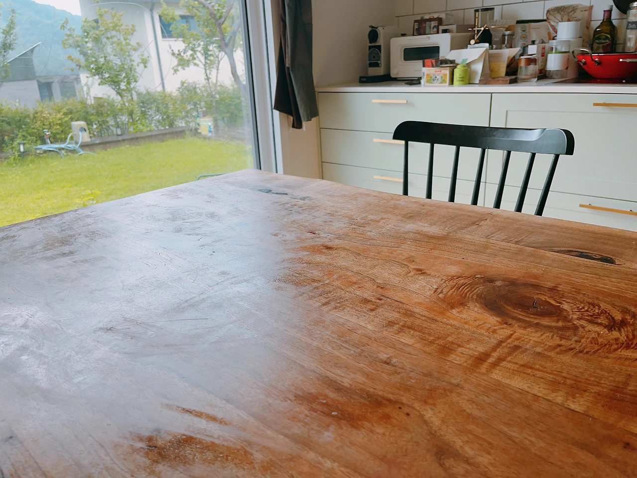 또 우드슬랩 식탁에 오일을 발랐다. 저번에 처음 내 만화로 진 만들기 도전했을 때도 식탁에 오일칠을 했다. 그때는 딴짓으로 회피하고 있다는 생각에 찝찝한 마음으로 칠했다. 그리고 진을 만들었다. 해낸 역사가 오일칠에 대한 느낌도 긍정적으로 바꾼 것 같다. 이번에는 일부러 오일칠을 했다.