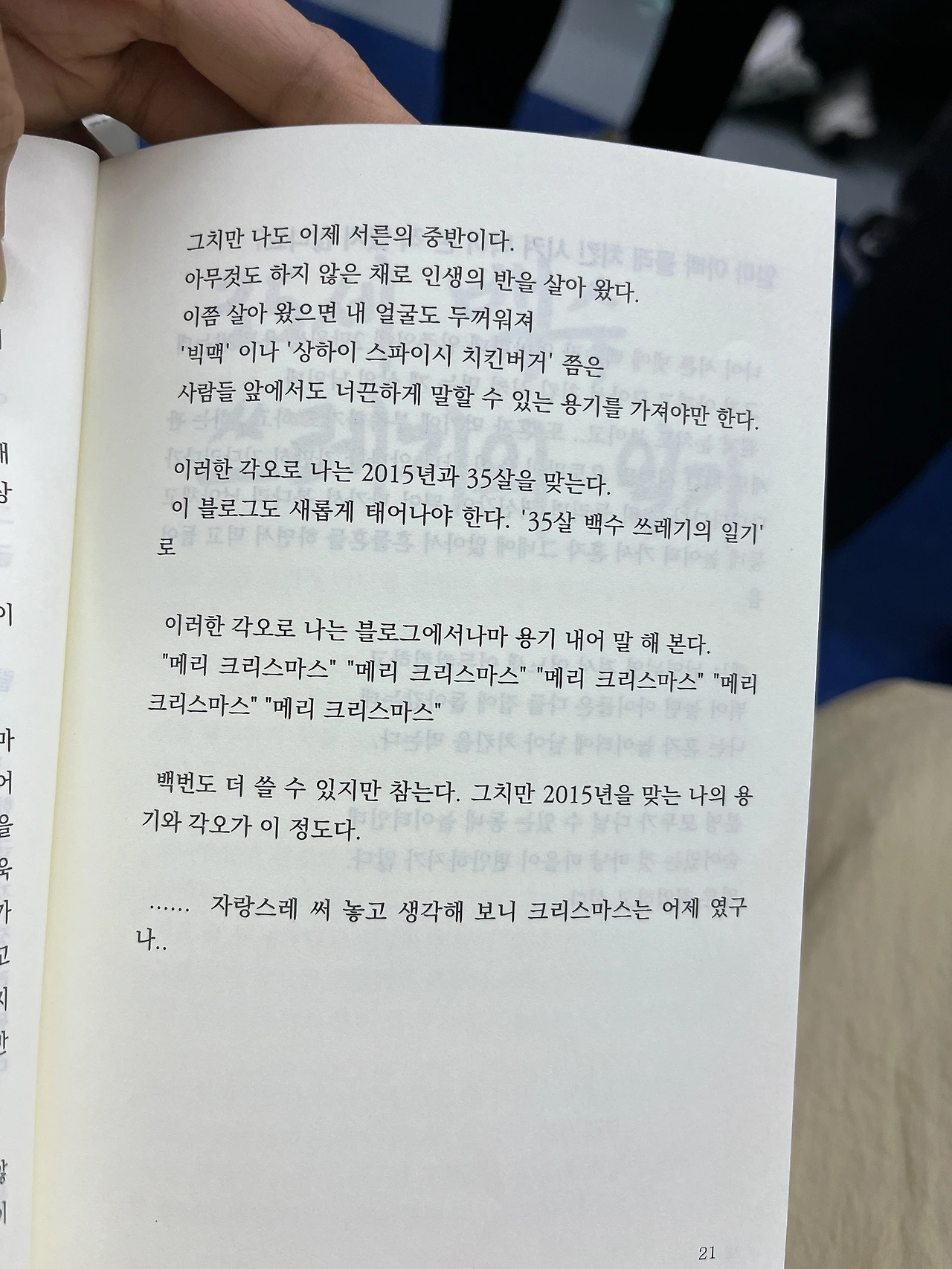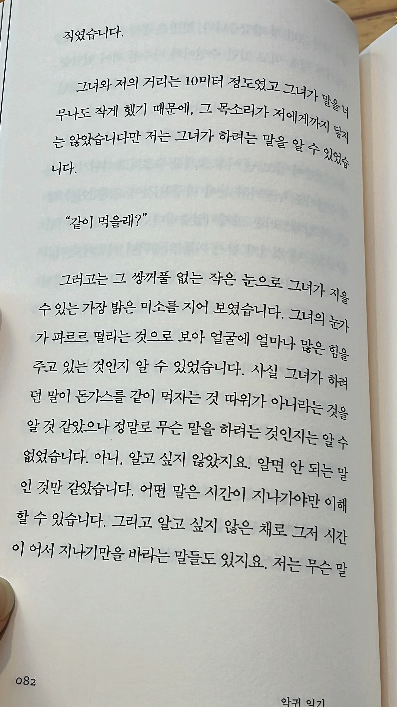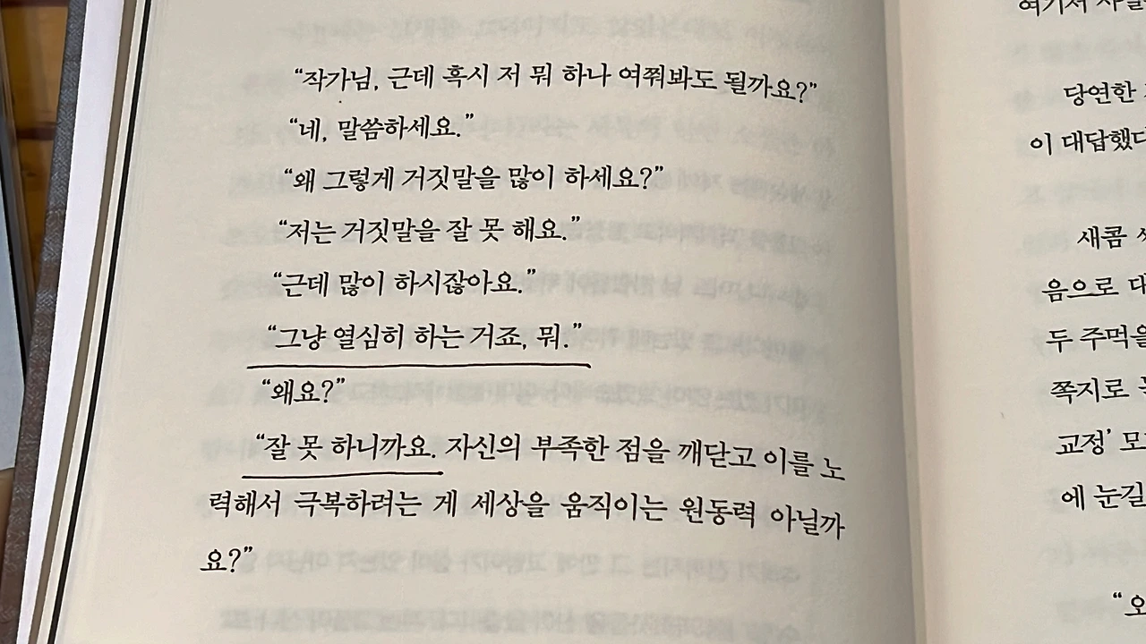 다음 날, 책에 사인을 받고 싶어서 다시 가지고 갔다. 어제 집에 가면서 다 읽었거든요. 이렇게 글로 써내신 게 정말 용기 있으신 것 같아요. 수줍게 사인을 하고 내밀며 그는 고개를 들어 눈을 맞추며 고맙습니다.라고 말했다. 책에서 타인과의 눈 맞춤이 어렵다는 글을 읽어서 그가 용기를 내었음을 알아볼 수 있었다.