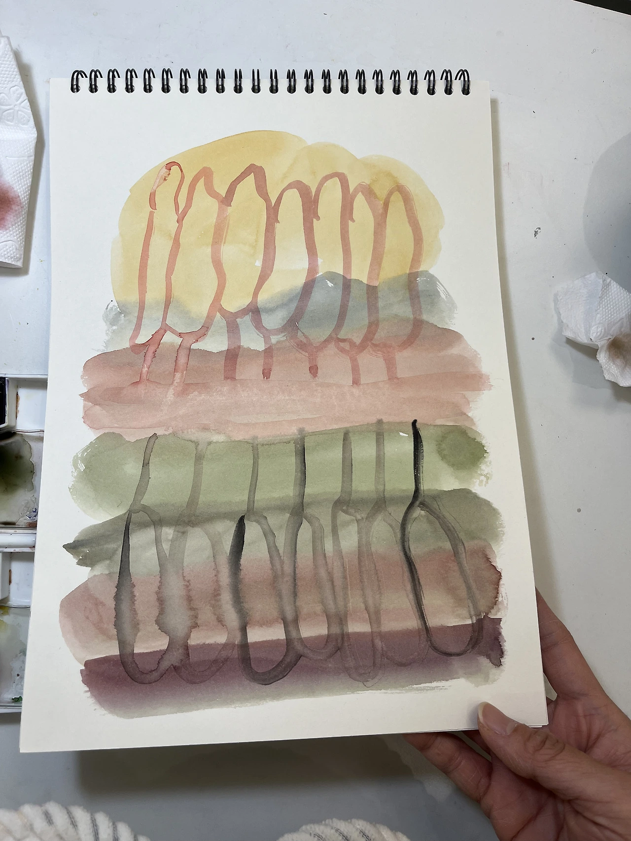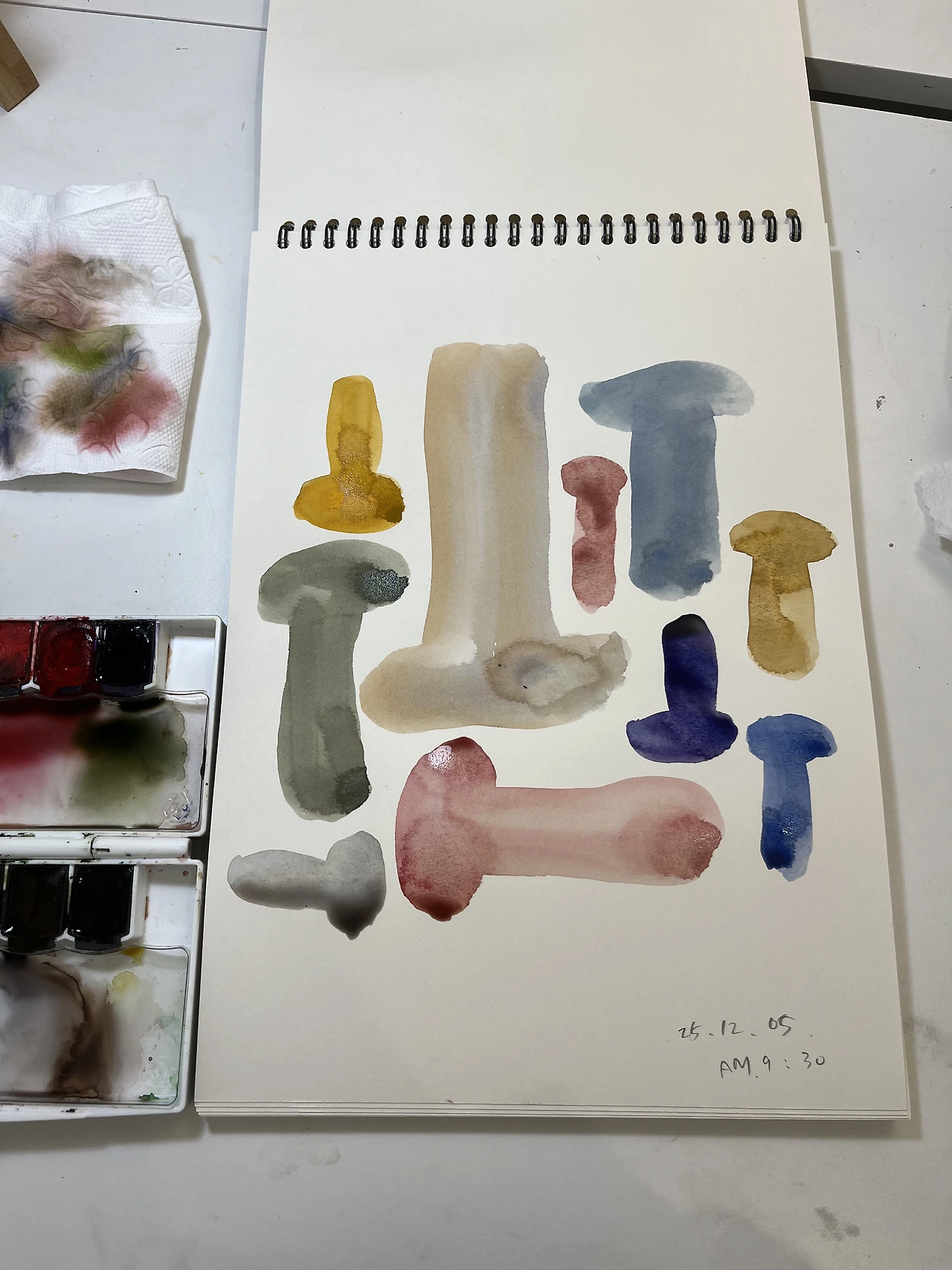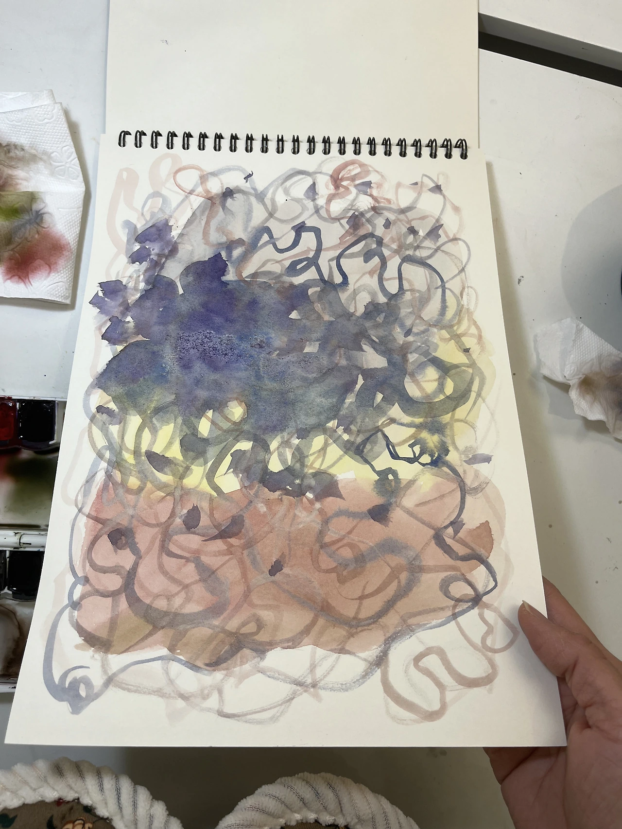 -동네 작가님이 아침에 자신이 좋아하는 색으로 그리는 ‘컬러 모닝 페이지’를 하고 계시대서 “오! 그거 저도 할래요.”라고 냉큼 말했다. 오늘 첫날인데 제일 자신 없는 수채화 팔레트를 객기로 꺼낸다. 추상으로 그리려고 했는데 자꾸 형태가 생긴다. 어쨌든 아침부터 예쁜 색을 쓰니 기분이 좋다. 내일은 오일파스텔로 그려봐야겠다.