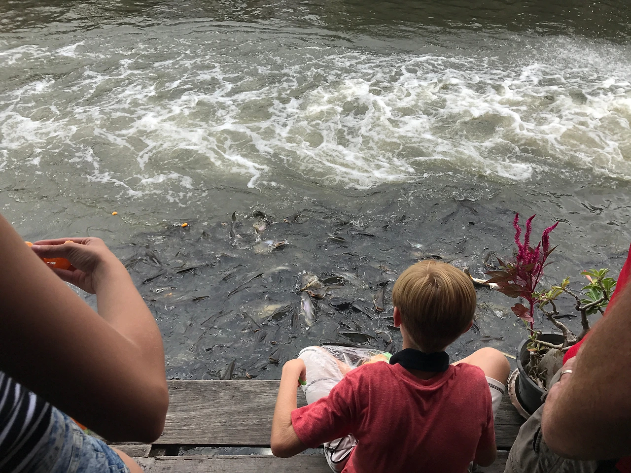 뻥튀기같이 생긴 물고기 밥을 사서 던져주는 아이들