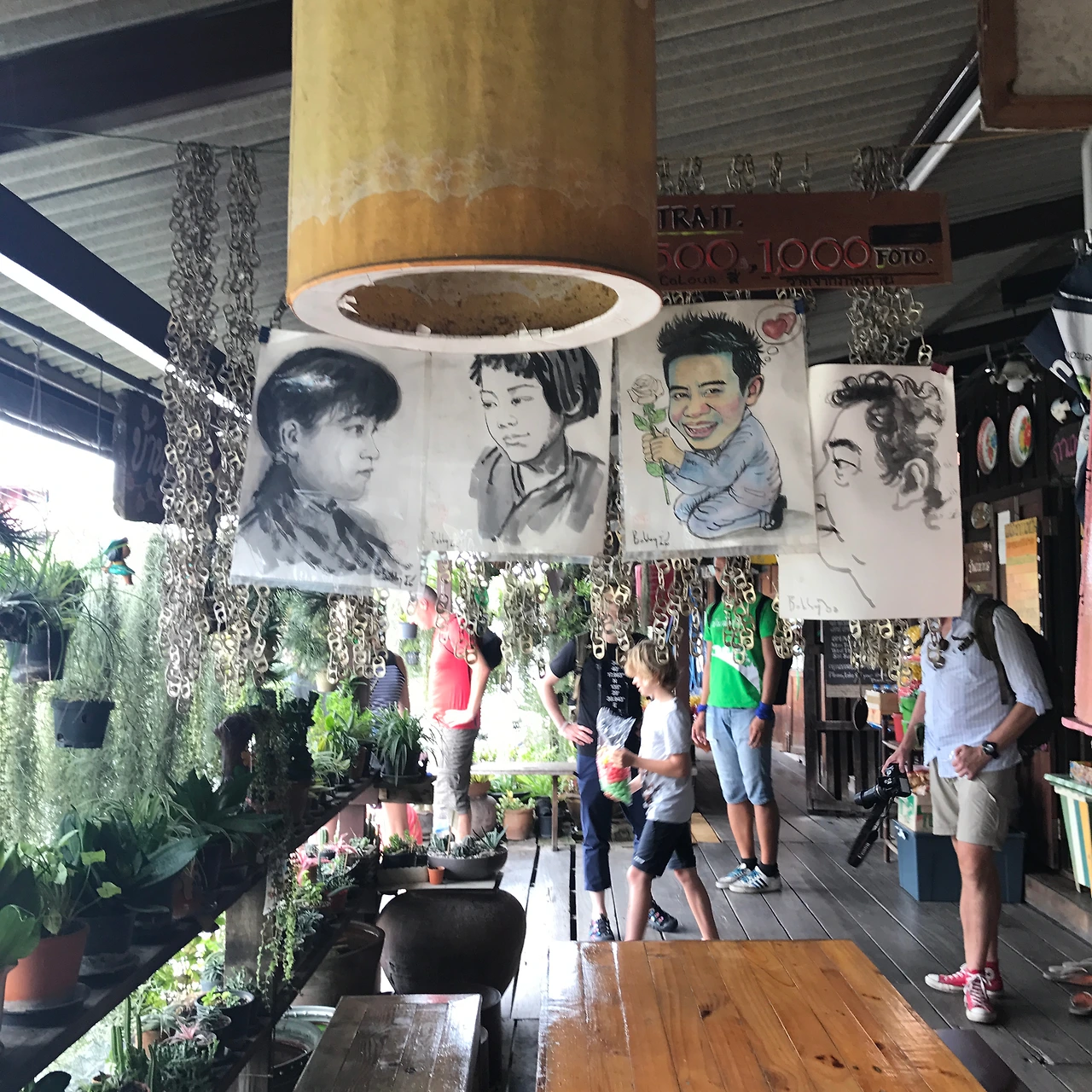 식사를 마친 후 아티스트 하우스를 찾아 조금 더 안쪽으로 들어가 보았다. 혹여 핸드폰이 떨어지지 않을까 조마조마해하며 담은 풍경들. 태국의 전통 목조 건물들을 비롯해 곳곳에 각종 그릇, 옷, 소품 등을 판매하고 있어 보는 재미가 넉넉했다.