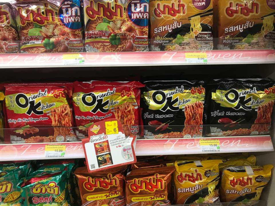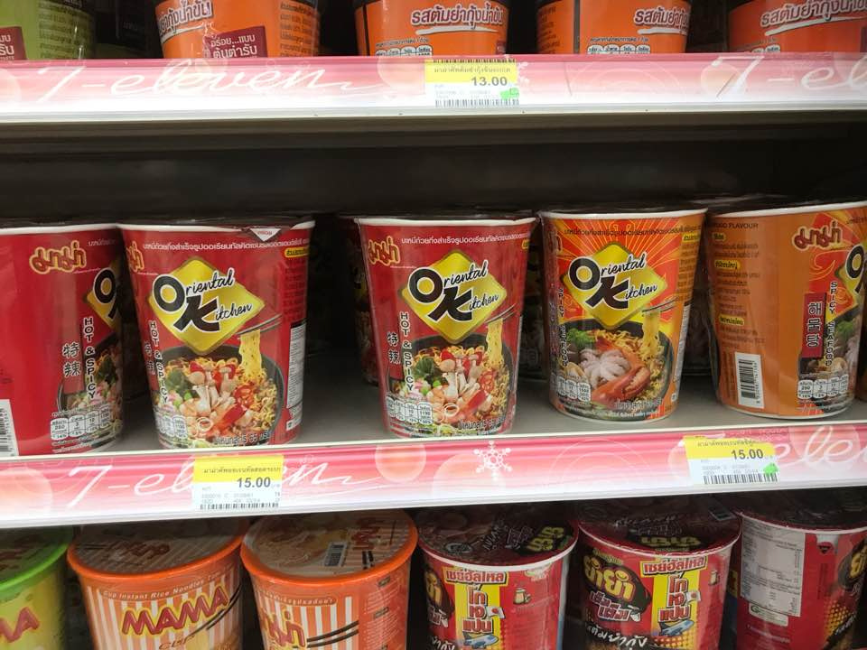 주황색 컵라면은 우리나라 너구리와 비슷한 맛. 똠 양 냄새가 많이 나는 태국 라면들과 달리 가장 한국적인 맛이다. 봉지라면으로는 볶음면 스타일의 제품도 있는데 개인적으로 불닭볶음면 보다 훨씬 맵고 맛있다고 생각한다. 한국에 있는 친구들에게도 몇 봉지 선물했는데 다들 엄청 좋아했다.