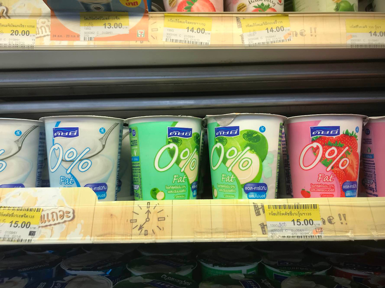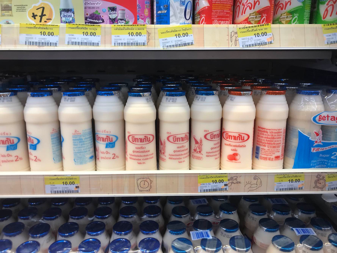 태국의 요구르트, 요구르트 맛은 한국과 크게 다르지 않다. 걱정 없이 도전 가능한 메뉴! 간혹 겉모습은 흰색 플라스틱 병에 담긴 불가리스처럼 약간 끈적한 요구르트일 거라 상상하지만 막상 오픈하면 완전 요구르트 색상인 음료들도 있으니 주의할 것. 참고로 요구르트는 사이즈가 다양한 편이다.