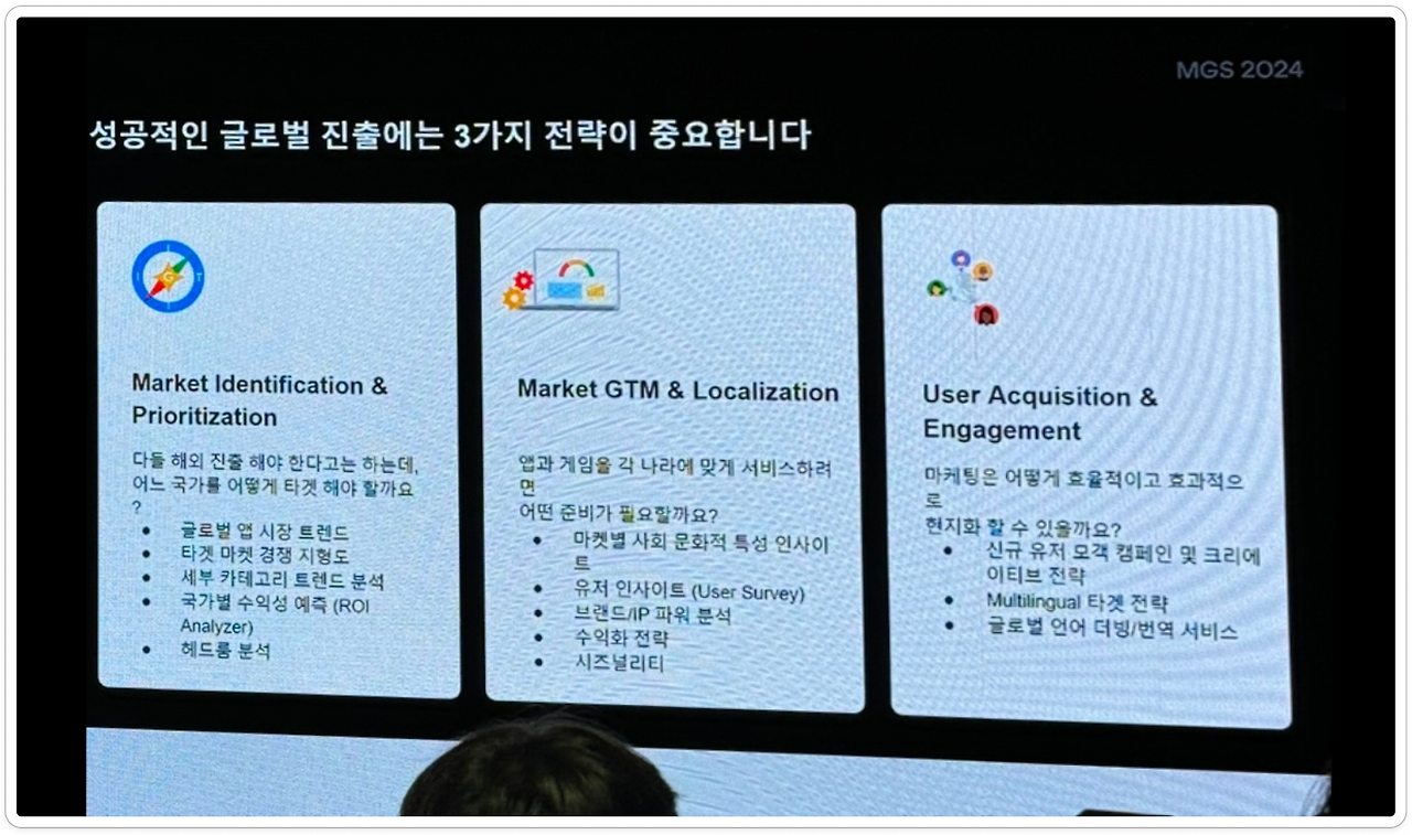 이번 컨퍼런스에서 가장 크게 와닿은 부분은 이 부분이었다. Google의 Head of Appdev Korea, 허윤님이 연사로 나오셔서 해주신 이야기들이 무척 인상 깊었다. 스타트업을 비롯한 많은 기업들이 글로벌 시장으로 나아가야 하며, 진출 시 어떤 점을 고려하는지가 스피치의 요지였다.