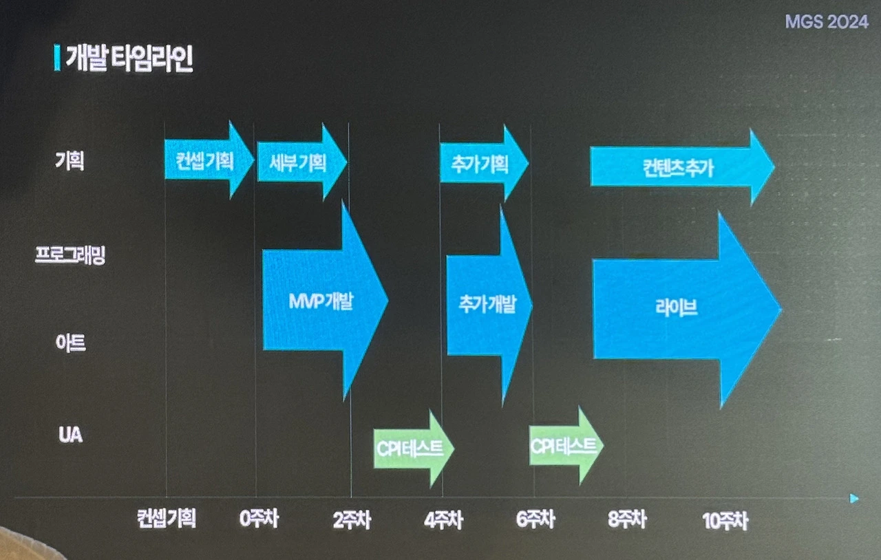 액션핏은 극한의 MVP(Minimum Viable Product) 전략을 선택하고 있었다. 그 이유는 게임 시장이 굉장히 빠르게 변하며(성공하는 게임의 컨셉이 계속해서 바뀐다는 뜻인 듯), 치열하게 경쟁하는 시장이기 때문이다. 때문에 25년에는 4~6명이 약 150~180시간(3~4주) 동안 1개씩 게임을 출시하는 것이 목표란다.