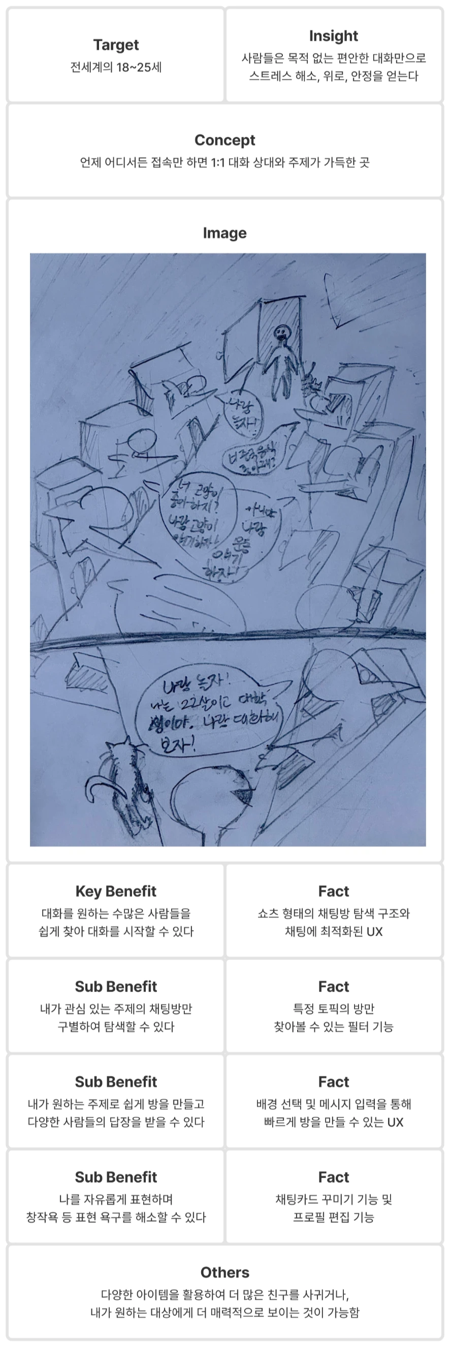 이 노트의 이름은 '컨셉 시트'로, 서비스의 컨셉과 직결되는 여러 요소로 구성되어 있다.