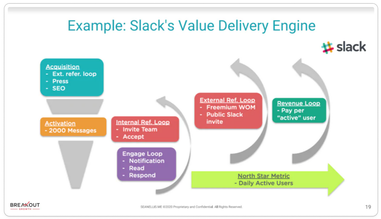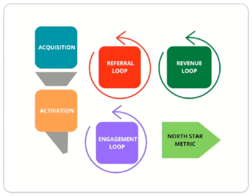 이 편의 가장 큰 과제는 아래 이미지를 이해하는 것이다. 이것은 Sean이 Value Delivery Engine이라고 이름 붙인 도식으로, 흔히 'AARRR'로 불리는 Funnel 모델을 일부 변형시킨 형태처럼 보인다.