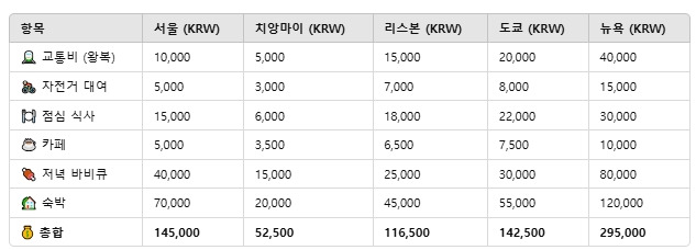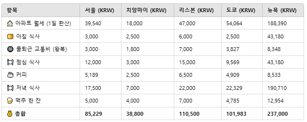 태국의 치앙마이, 포르투갈의 리스본, 일본의 도쿄를 추가해서 표를 만들어보았다.