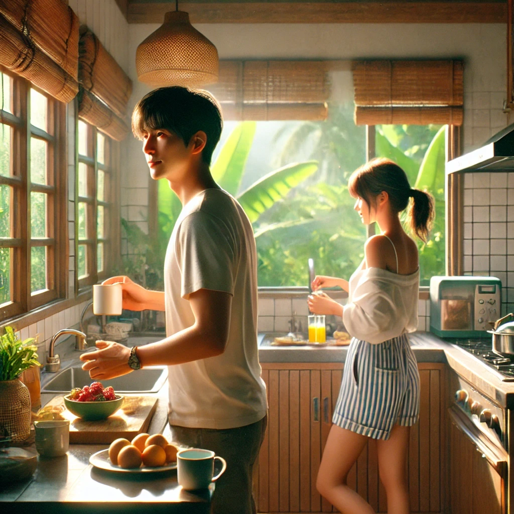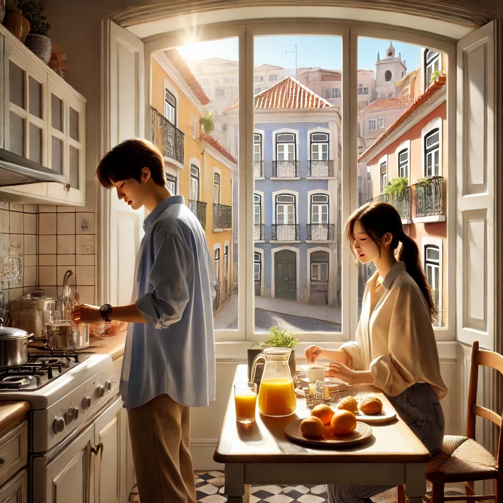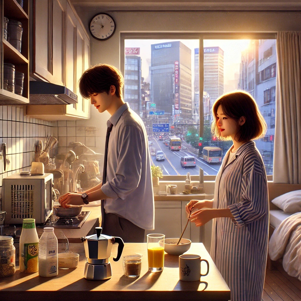 아침 7시, 서울 도심의 작은 아파트에서 민수와 지혜가 하루를 시작한다. 창문 너머로 비치는 햇살이 부드럽게 침실을 감싼다. 민수는 부엌으로 나가 커피를 내리고, 지혜는 간단하게 시리얼과 우유를 챙긴다. 서둘러 씻고 옷을 갖춰 입은 두 사람은 문을 나선다. 출근길, 민수는 강남으로 향하고 지혜는 여의도로 향한다. 지하철은 여전히 붐비지만, 이젠 익숙한 일상이다. 서로 다른 방향으로 걸음을 옮기며 "오늘 저녁엔 외식할까?"라는 약속을 나눈다.