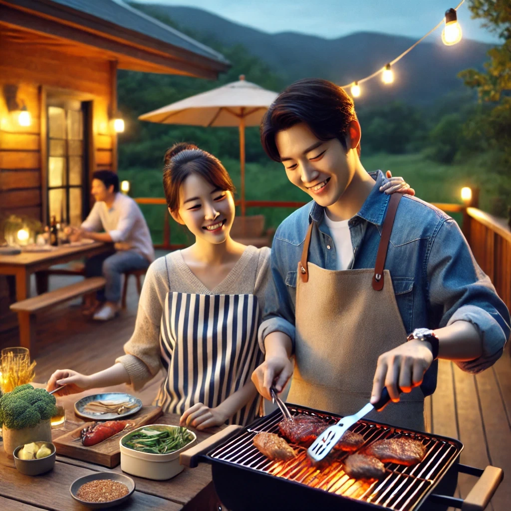 저녁이 되자 야외 바비큐를 즐기고, 펜션에서 하루를 마무리한다.
