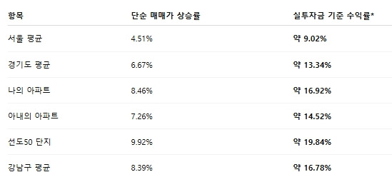 우선 아파트의 과거 가격 변화에 대해 살펴보았다. 서울 아파트의 연평균 가격 상승률은 과거 30년 간 4.8%였다. 20년 간은 3.9%, 10년 간은 4.5%였다. 과거 10년간 경기도 아파트는 6.7%, 강남구 소재 아파트는 8.4%, 대한민국에서 가격 총합이 많은 50개 단지 지표인 '선도 50 아파트'는 무려 9.9%에 달했다. 아내의 강북 아파트는 7.3%, 나의 인덕원 아파트는 8.5% 수준이었다. 아파트를 거주용이 아닌, 투자용으로 보유한 상황이라면 전세가율 50%로 일괄 적용해 보면 과거 10년간 연평균 수익률은 대략적으로 다음과 같다.