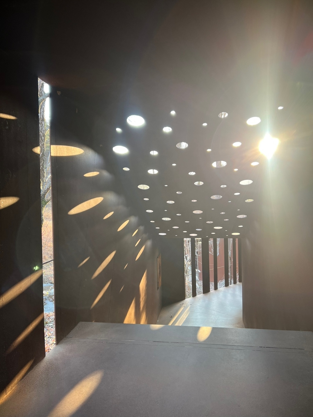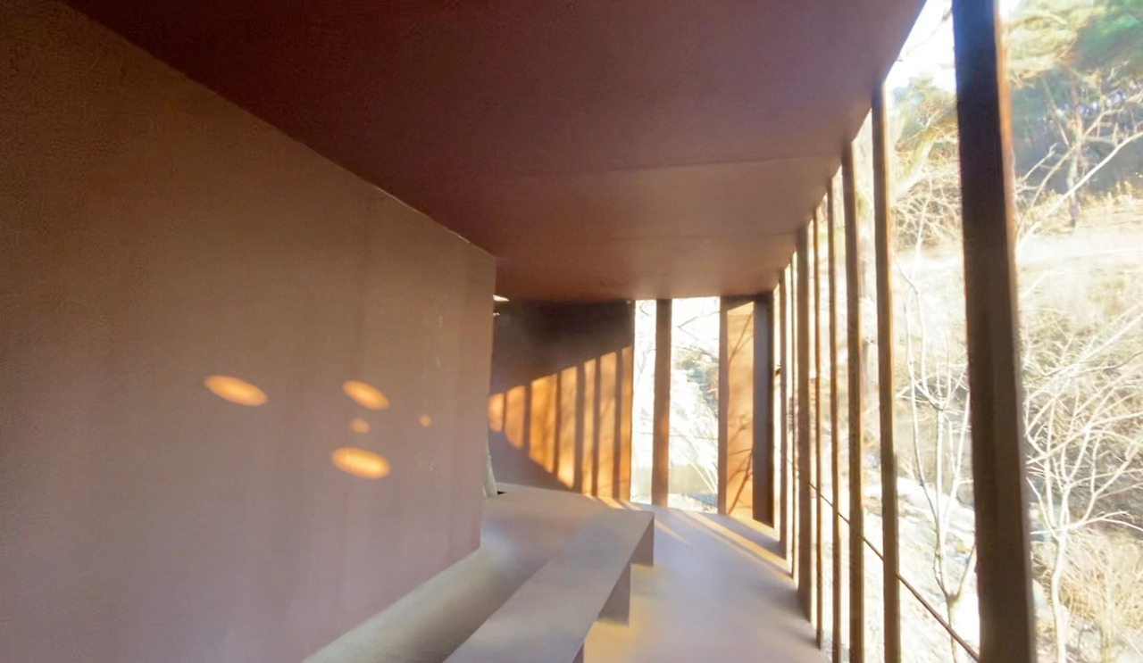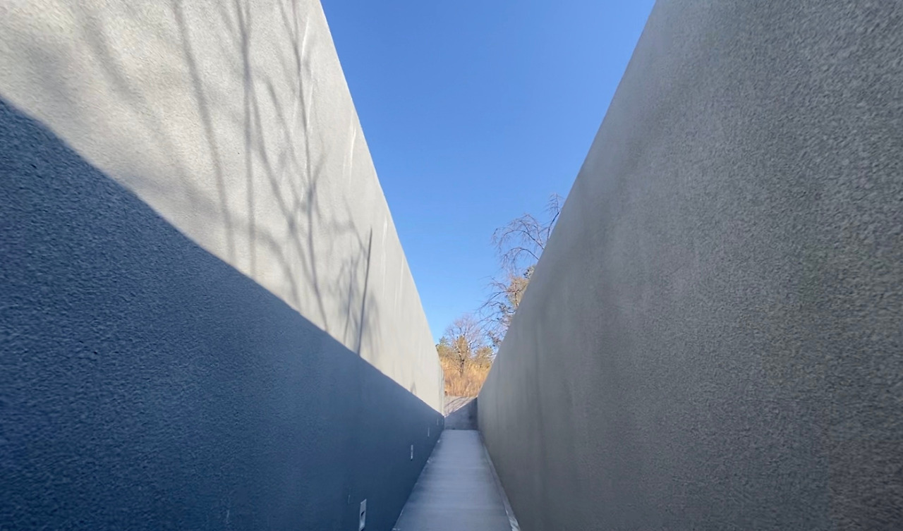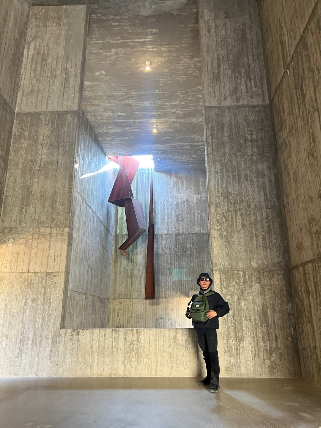콘크리트 벽과 하늘을 향해 뻗은 강렬한 철제 구조가 인상적이며, 걷는 행위 자체가 사색이 되도록 설계된