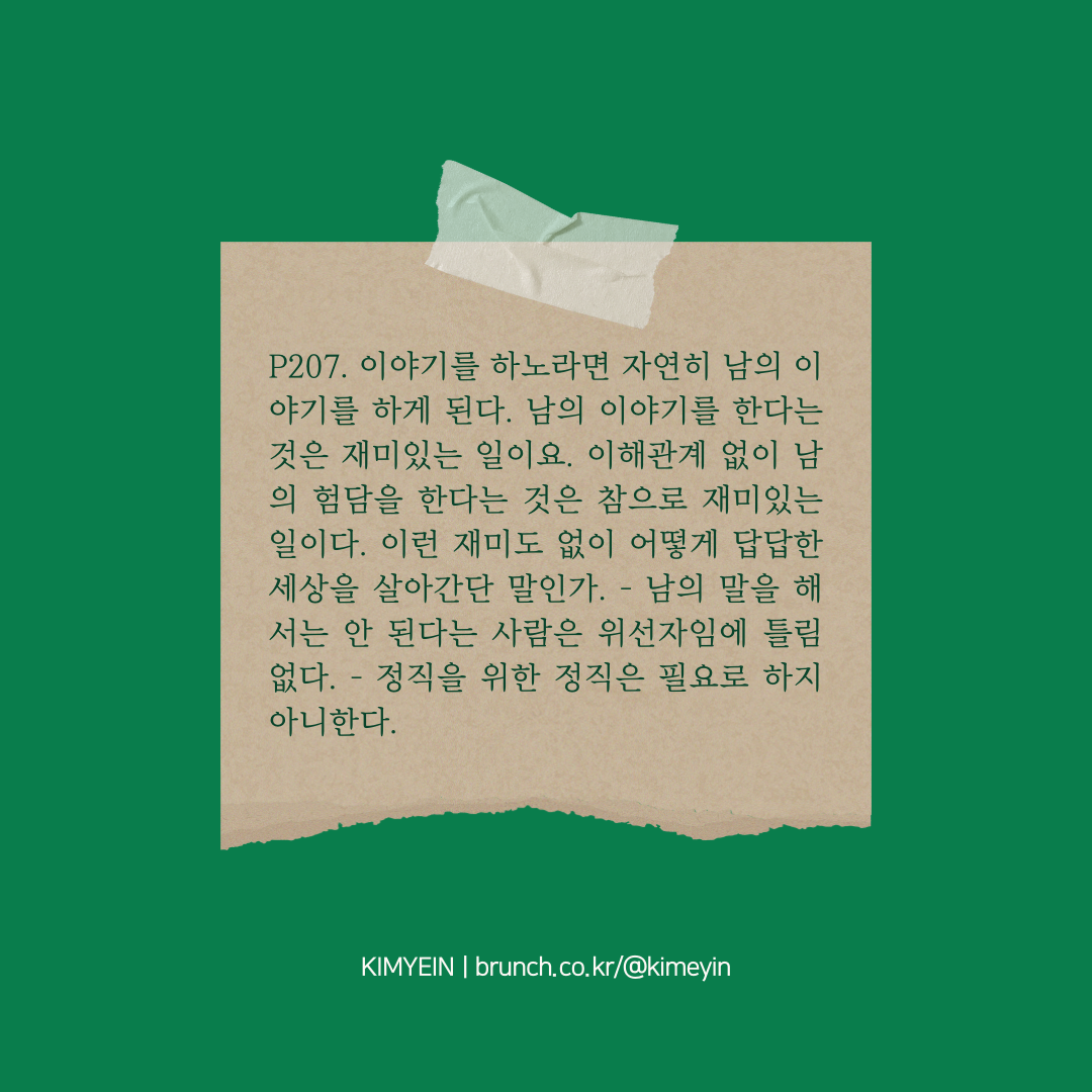 피 선생은 갑자기 때로는 남의 이야기를 하는 것에 대해서 말하시는데, 정직하고 우직하신 그의 글들을 읽다가 왜 그런 말을 하신 걸까 싶었다. 내 마음을 건드는 무언가가 이 글에 적혀 있던 것이 분명했다. 그의 말이 뒤에서 말하기를 권유하는 말이 아님을 깨달았다. 세상 살아가며 정직하고 선하게 사는 것이 미덕이지만 그것으로 인해 자신의 마음을 옭아매지 말라고, 마음의 여유를 가지며 살라는 말이었다.