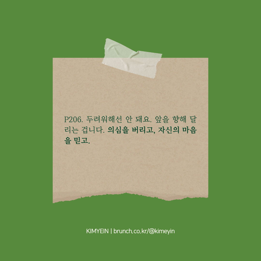 P206. 두려워해선 안 돼요. 앞을 향해 달리는 겁니다. 의심을 버리고, 자신의 마음을 믿고.