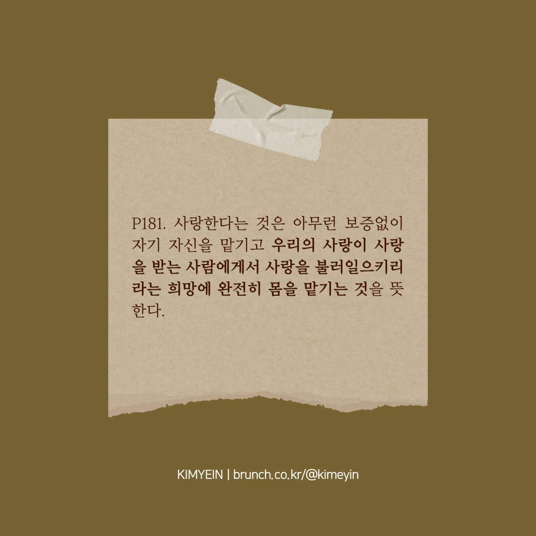 사랑은 강제된 결과로 절대 나타날 수 없다는 것이 인상에 남는다. (누군가 나를 좋아한다고 해서 내가 그 사람을 좋아할 수 있는 건 아니기 때문에) 그런데 진정으로 사랑한다면 사랑은 자연스레 사랑을 불러일으킨다. 어린아이(‘나는 사랑받기 때문에 사랑한다.’)는 받았기에 사랑을 주지만 성숙한 사랑은 참으로 주는 것이다. 받을 것을 생각하며 주는 것이 아니다. 그저 주는 기쁨을 알고 주고, 그것으로 기뻐하는 것. 그리고 그 사랑은 사랑을 일으킨다는 것이 놀라웠다.