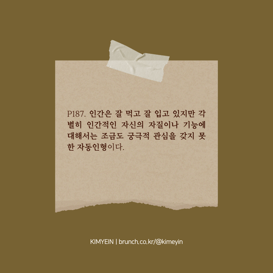 P162. 바로 이 순간하고 있는 활동이 유일하게 중요한 일이 되어야 하고 이 일에 몰두해야 한다. 만일 정신 집중이 되었다면 지금 ‘무엇’을 하고 있느냐 하는 것은 별로 중요하지 않다. 중요한 일이나 중요하지 않은 일이나, 우리의 충분한 주목을 받게 되기 때문에 새로운 차원의 현실성을 갖게 된다.
