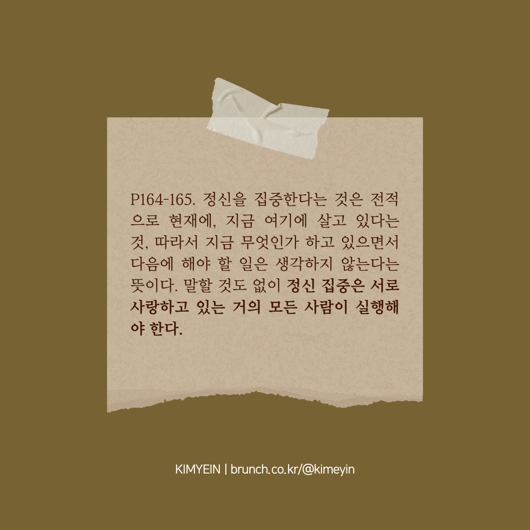 종종 우리는 몸은 여기 있는데 정신은 저기 멀리 가 있는 경험을 한다. 사랑하는 이와 함께하는 현재에 집중하는 것이 필요하다. 또한 그와 함께하는 순간이 아닌 혼자일 때에도 건강하게 자신의 삶에 집중하는 것도 중요하다. 어떤 대화에서 정신집중해서 듣는다면 내가 더 피로하리라고 생각을 한 적이 있다. 그러나 그렇게 행하고 돌아온 날이면 지금처럼 그 생각에서 벗어나지 못하고 생각의 바다에서 허덕이곤 했다.